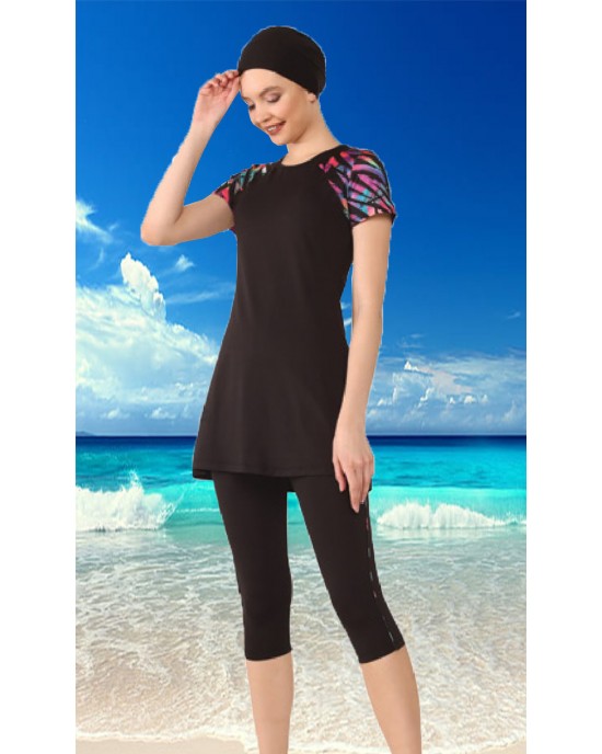 0446 Büyük Beden Kısa Kollu Yarım Kapalı Taytlı Mayo Siyah tesetturmayoburada