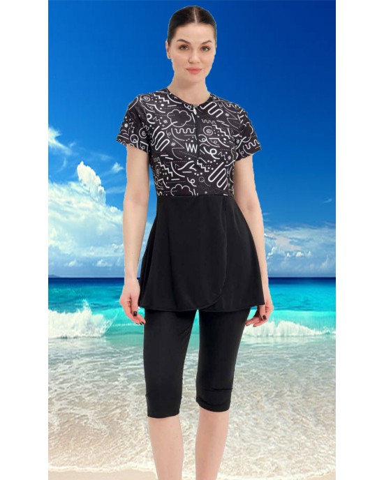 2312 Siyah Beyaz Yarım Kapalı Taytlı Mayo tesetturmayoburada