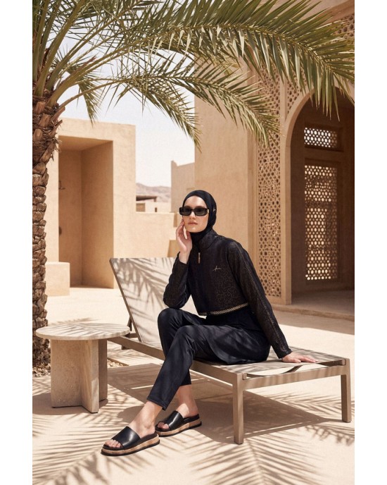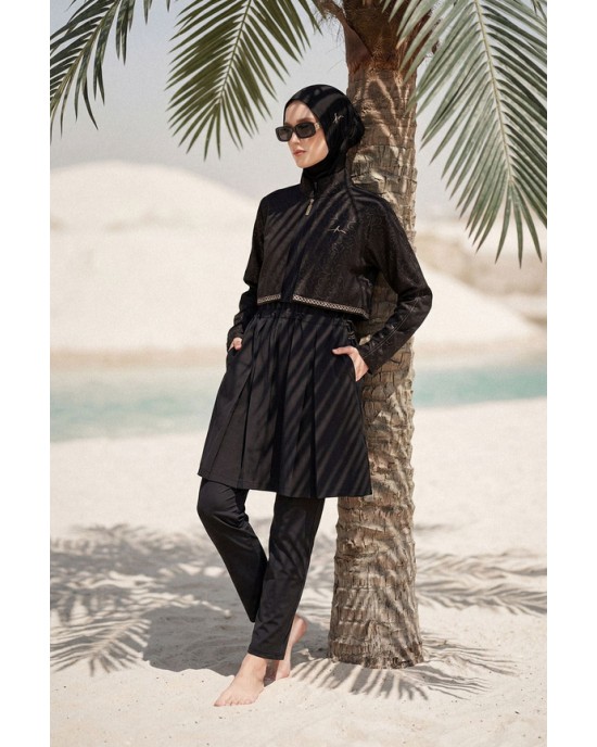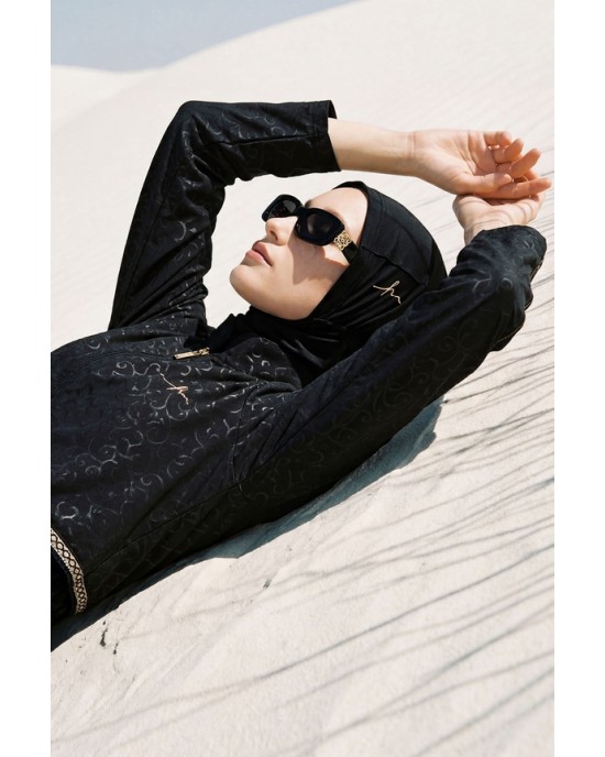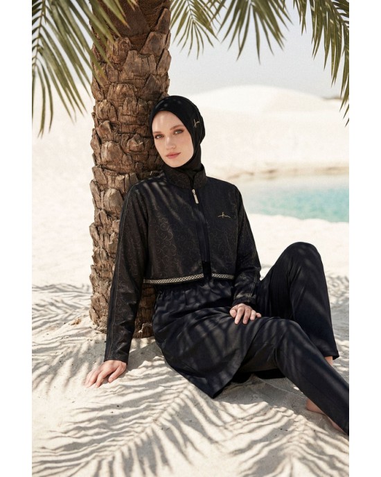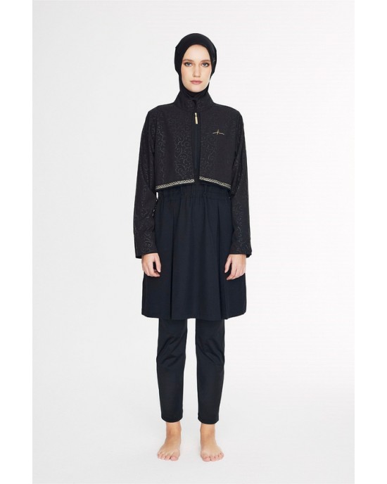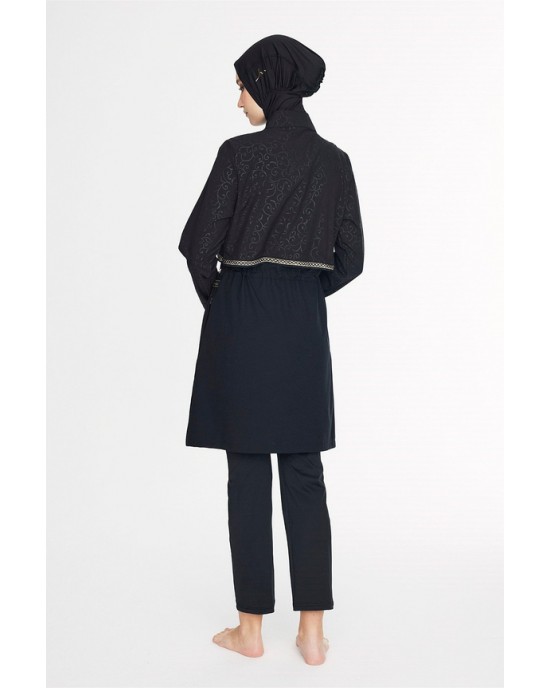 5087 Siyah Vaha Dokulu Kumaş Nakışlı Detaylı 5 parça Tesettür Mayo tesetturmayoburada